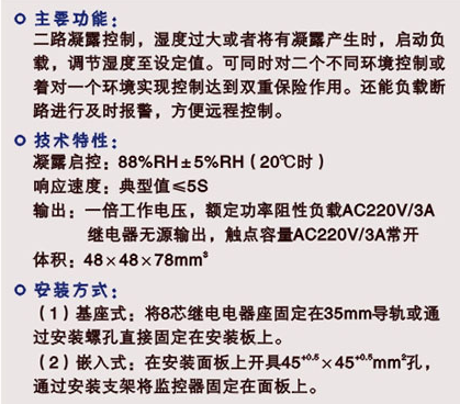 二路凝露控制,湿度过大或者将有凝露产生时,启动负载,破坏产生凝露的条件。可同时对二个不同环境控制或者对同一个环境 实现双重控制